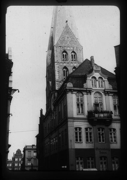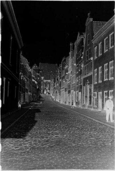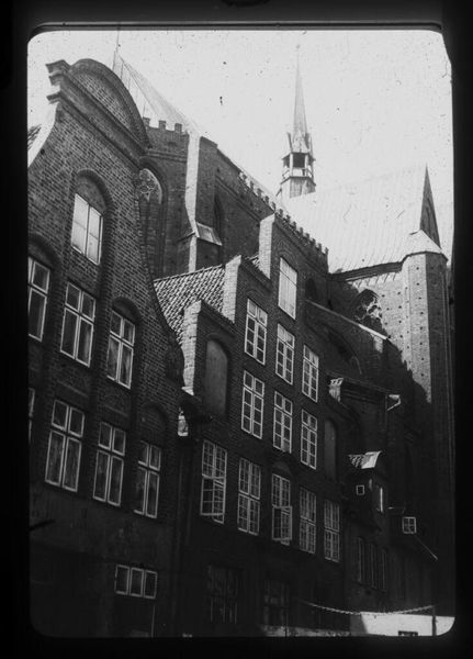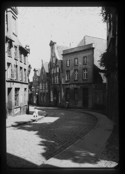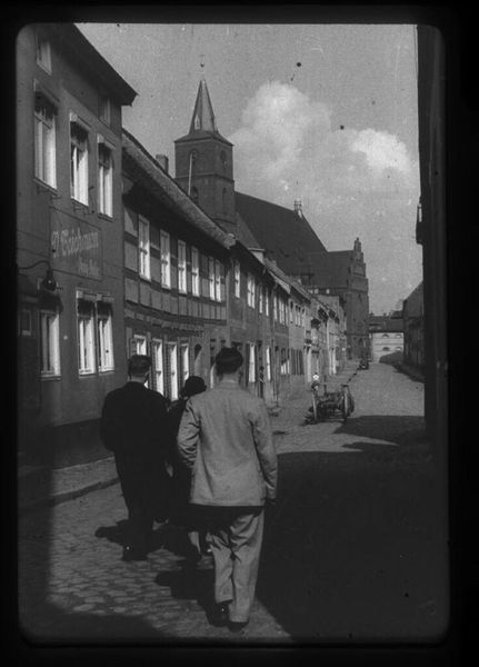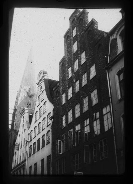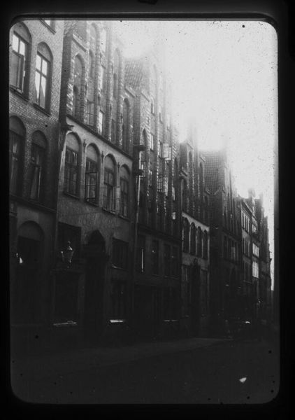 Editor: This photograph, titled "Street scene, Lübeck," attributed to Laurence Feininger, captures a European street. The stark contrast and the towering buildings give it a somewhat imposing feel. What do you see in this piece? Curator: The shadows evoke a particular time, perhaps hinting at the weight of history. Note how the church steeple pierces the sky. What does the steeple signify to you in relationship to the street and buildings? Editor: I suppose it’s a symbol of faith rising above the everyday concerns. Curator: Precisely! It could be about cultural memory, the enduring presence of the church amidst the ebb and flow of daily life. It asks us: What remains? Editor: I see that now. Thanks! Curator: My pleasure. It’s all about reading the symbols.