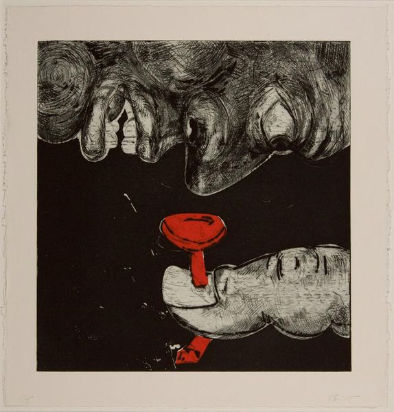 Curator: What I find arresting about Sue Coe’s print, simply titled "Boot", is its immediacy. I feel a jolt, an unpleasant recognition of power… the kind that makes you recoil a little. Editor: Yes, recoil is exactly the right word. The stark, almost brutal, rendering immediately evokes a feeling of unease. There's something inherently sinister about the looming foot and the helpless-looking piglets below. I wonder, what draws you to this work, personally? Curator: Well, beyond the raw emotion, I’m captivated by Coe’s ability to weave together themes of domination and vulnerability. Notice the composition; it's incredibly unbalanced. The heavy, dark boot dominates the frame, dwarfing both the tiny, distant figure in the background, and the even smaller pigs below. Editor: And that foot! It feels deliberately ambiguous. Is it a human foot? A monstrous creation? It's both terrifying and anonymous, symbolic of a vast, faceless power. Consider also the historical use of the pig motif: from Ancient Greece to Orwell's Animal Farm, pigs are laden with symbolic weight, representing everything from gluttony and greed to political corruption and mindless following. Curator: Right! Coe layers these potent symbols in a way that feels viscerally honest. It’s not just a political statement; it’s a howl of protest, etched into the very lines of the print. The almost claustrophobic perspective—as if we’re trapped on the ground with these piglets—makes it deeply affecting. She pulls us right into the thick of it, confronting us with a perspective that is both confronting and undeniably moving. What lingers most for you after experiencing the work? Editor: It is, undoubtedly, the work's unflinching nature. "Boot" avoids any easy resolution, challenging us to grapple with uncomfortable truths about power dynamics and the consequences of unchecked authority, making its message resonate deeply and hauntingly. Curator: Ultimately, it feels like a stark invitation—or dare I say, a summons—to consider our place in the system, and question what power we ourselves wield, and towards what ends.