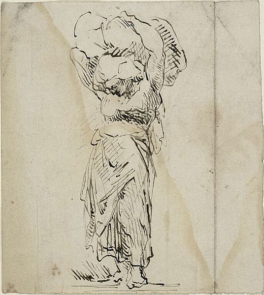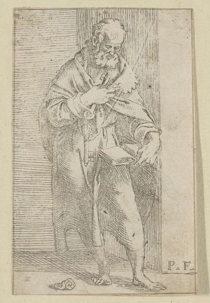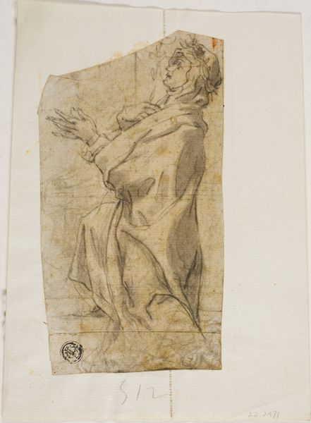 Curator: This intriguing drawing, entitled "Standing Male Figure," was created in 1673 by Salvator Rosa. The work is currently housed here at the Museum of Fine Arts Houston, created using ink on paper. Editor: My first thought is of constraint, the feeling of something caught in between states of movement and stillness. The figure's pose and the rough pencil sketch marks amplify that feeling. Curator: Rosa was quite popular for his narrative scenes and figural studies. We can view this as part of a larger visual culture where representations of male authority, philosophical introspection, and moral leadership were being presented and debated. He was engaging with existing frameworks for these masculine portrayals while innovating in areas of dramatic presentation. Editor: Yes, and it's hard to miss the head covering that is something akin to a turban. It infuses the figure with an air of Eastern mystique, a sort of learned scholar perhaps. The open hand gesture almost seems to echo a symbol of offering or a sharing of knowledge. Curator: Indeed. Consider also the sociopolitical dimension. Seventeenth-century Italy was marked by aristocratic patronage networks that supported such artistry, ensuring it reflected the patron's values and tastes and, thereby, reinforces their prestige and power through art. Editor: I am more drawn to what might feel archetypal. Rosa appears fascinated by something just beyond the visible spectrum, doesn't it feel like it's about trying to connect with ideas of legacy? He really does evoke this tension between earthly life and more meaningful narratives beyond our understanding. Curator: The artist’s deliberate stylistic choices are key to how this resonated in the cultural context of the time. He presents his figures in very raw, sketch-like ways rather than with a polished idealism that suggests a very self-conscious approach to art production itself. It feels like Rosa is questioning these long-held norms, pushing against constraints both aesthetic and social. Editor: Well, viewing "Standing Male Figure" does provoke a fascinating reflection on the continuous push-and-pull of artistic vision! Curator: Agreed, it underlines the value of exploring beyond surface interpretations in art history, recognizing how visual pieces can simultaneously uphold and contest established systems of thought.