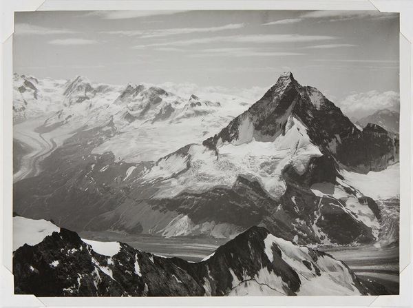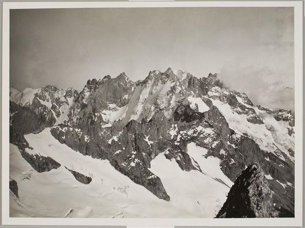 Curator: Vittorio Sella captured this striking photograph, "Koshtau-tau from the Ridge of Fytnargyn, Central Caucasus." Editor: Wow, it looks so imposing! All those stark, rocky peaks dusted with snow… I feel a bit breathless just looking at it. Curator: Sella's work resonates within the late 19th-century discourse of exploration and the picturesque. Photography, in that context, became a tool for documenting and, in many ways, claiming landscapes. Editor: Claiming, huh? It does make me wonder, what did the people native to that area think of these photographs? Were they part of the narrative, or just the backdrop? It’s beautiful, but a bit…cold, maybe? Curator: Precisely. The absence of human presence, or perhaps, the erasure of certain presences, speaks volumes about the power dynamics at play. Editor: Makes you think about who gets to tell the story, doesn't it? I’ll definitely be pondering that as I move on.