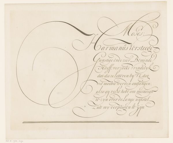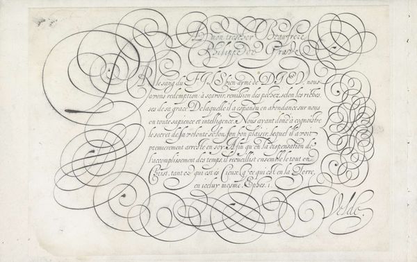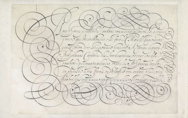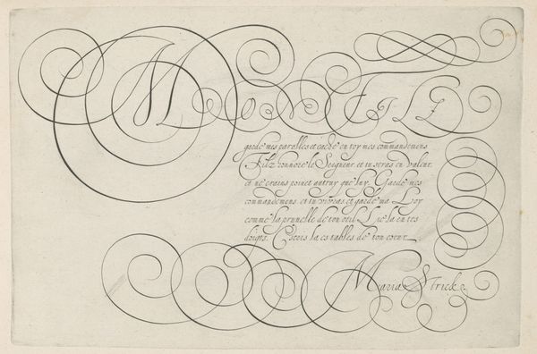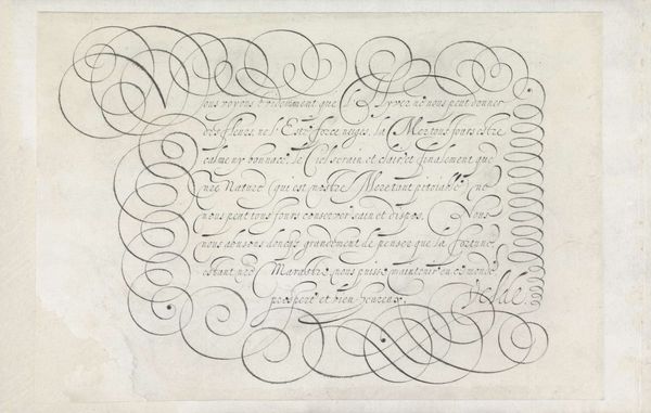 This ‘Design for a writing sample’, was made by Jan van de Velde I in the Netherlands, sometime around the early 17th Century, using etching. At this time, the Dutch Republic was a major center for trade and commerce, and handwriting was an essential skill for merchants, diplomats, and other professionals. Van de Velde's print gives us insight into the cultural values placed on literacy and education during this period. The elegant calligraphy and elaborate ornamentation suggest the importance of aesthetics and refinement in Dutch society, and the dedication to Giovanni Bontio, a doctor, hints at the patronage networks that sustained artistic production. By researching the social and economic conditions of the time, we can better understand the cultural significance of this print, recognizing that even something as seemingly mundane as a writing sample can tell us a great deal about the values, aspirations, and institutions of its time.