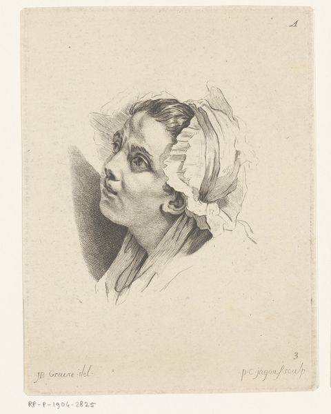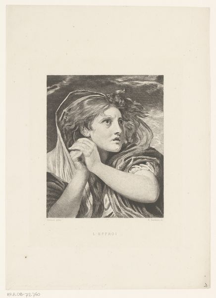 Curator: Here we have Achille-Isidore Gilbert’s “Head of a Young Woman,” created around 1881. The artwork is an ink print on paper, notable for its tonal qualities and the substantial negative space surrounding the central image. Editor: It's rather melancholic, isn’t it? The way she gazes upwards, almost pleadingly, gives off a sense of yearning, but also of restraint, held captive perhaps? Curator: Gilbert’s focus was certainly on evoking feeling. Looking at the printing process, we can observe a labor-intensive method that contrasts with today’s reproductive techniques. This highlights a crucial shift in art production and consumption during the late 19th century. Editor: And what about the identity of this woman? Who was she, what class did she come from? Her attire looks deceptively simple but reveals layers of 19th-century sartorial culture, signaling class and social expectation. The very act of creating and circulating her portrait also served to socialize expectations about ideal feminine beauty and expressivity. Curator: Precisely. We see these notions meticulously etched onto the paper through the hand-printing process. It makes us question who gets to dictate these ideas and who performs the labor of both representing and adhering to them. The materials themselves – the ink, the paper – carry their own historical weight too. Where were they sourced? Who processed them? The creation of this image involves so much more than just Gilbert's artistic choices. Editor: True, this extends into the dynamics of viewing—are we looking empathetically or imposing further expectations onto her gaze? By placing this artwork within discourses of gender, representation, and material labor, we are acknowledging these interconnected facets of a historical moment still resonating today. Curator: That is a valuable perspective. Analyzing how this image was physically brought into existence sheds light on how social values are embedded into art itself. Editor: Indeed. It shows the artist's influence while allowing room to examine broader cultural narratives surrounding her portrayal. Curator: A reminder of the multifaceted lives intersecting within this single, captivating print. Editor: Agreed, it’s prompted so much richer thought on that beautiful melancholic gaze.