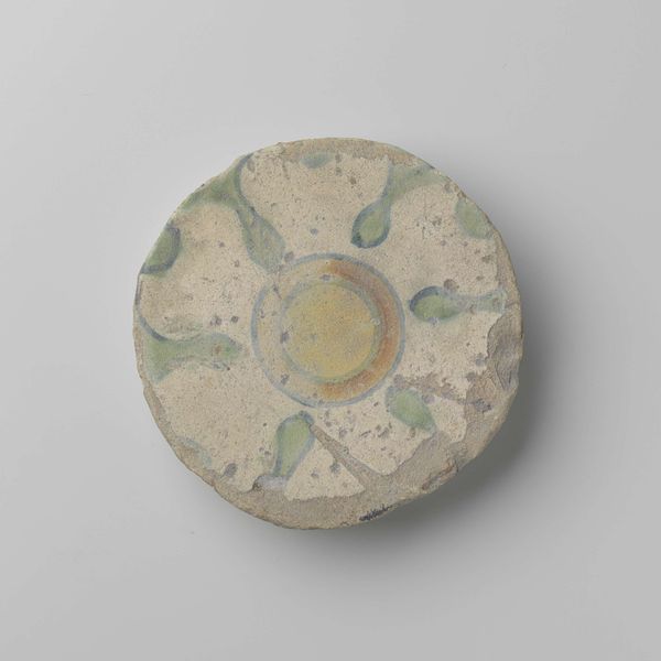 Curator: This is a striking round brooch crafted between 1915 and 1925 by the artist Homme de Vries. The brooch is a composition of copper, enamel, and garnet, showcasing the distinct style of Art Nouveau. Editor: It evokes an image of ancient armor, perhaps from a fantastical civilization. The concentric circles, punctuated with tiny golden rivets, and the central dark garnet against the smoky enamel – it’s both delicate and strong. Curator: The material choices here are intriguing. The artist uses the brass's warmth as a counterpoint to the cool, almost misty surface of the enamel. Note also the meticulous arrangement of small golden rivets forming the circles. The dark, gemlike garnet centers the work, commanding visual authority. Editor: The circles draw the eye in, centering on the deep garnet. But more than just beauty, I think there is social commentary present too. Brooches were historically signifiers of wealth and status, especially among women, reflecting the constraints placed upon them. Curator: Perhaps. We might instead observe how the meticulous craftsmanship of the metalwork showcases the Art Nouveau aesthetic. The decorative form is allowed to dominate, embracing a total work of art as imagined by the Arts and Crafts movement. Editor: Still, even these formal artistic choices can be read as part of a larger conversation. The ornamental value is inherent, but to only analyze form divorces this object from its historical place. Acknowledging both beauty and possible critical meanings allows for deeper engagement. Curator: A compelling perspective. Certainly, approaching art from multiple viewpoints enriches understanding. I am struck, once more, by the interplay of rough and refined that adds so much complexity to the brooch's design. Editor: Exactly. Examining not only the artistry, but the cultural implications embedded within jewelry from this era, makes the work infinitely more poignant. It bridges aesthetics and lived realities.