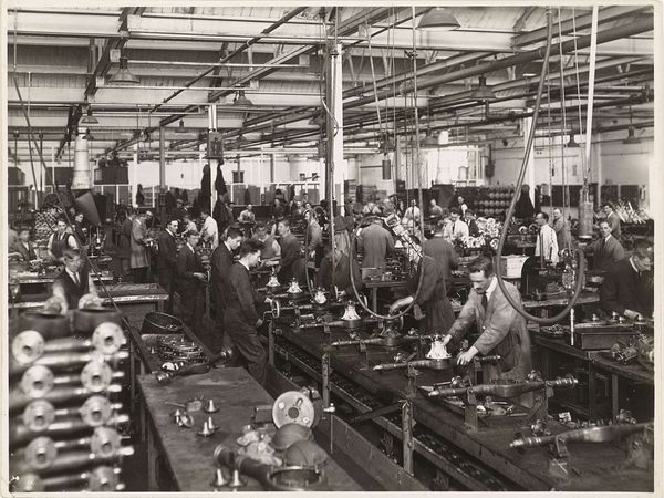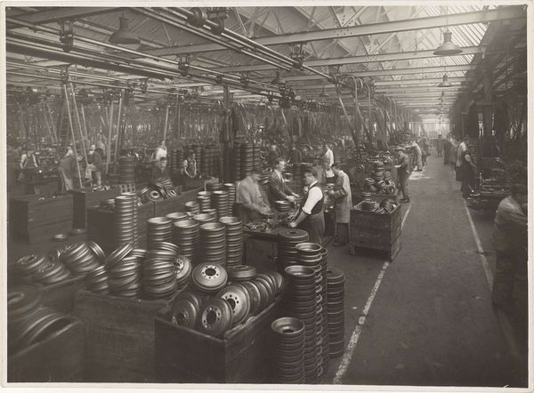 Editor: This gelatin-silver print, taken in 1932 by F.R. Logan, presents "Machines van de Wolseley Motor Company in de Ward End Works, de fabriek in Birmingham" – or, the Wolseley Motor Company factory in Birmingham. It’s overwhelmingly mechanical; the repetition of machines stretches far into the distance. How does the photograph capture the industry of the time? Curator: Indeed, this image is powerfully representative of its time, socially and culturally. The factory setting is key. Photography like this became a powerful tool for both documenting and, frankly, celebrating industrial progress. Notice how the artist frames the scene. Editor: You mean how the photograph emphasizes order? Everything is lined up so neatly. Curator: Exactly. It projects an image of control, efficiency, and modernity – values that were increasingly important as industry expanded in the early 20th century. However, what about the workers? We don't see a single person. Editor: That’s a good point. It’s as if the machines themselves are the heroes of the story, not the people who operate them. The framing feels deliberate, doesn't it? It presents a specific narrative about industrial progress, while also raising some unspoken questions. Curator: Absolutely. Who is the photograph for, and what is its purpose? Is it purely documentation, or is it meant to impress or even propagandize a particular view of industry? Consider who controlled these images and how they were disseminated. Editor: I see how examining this artwork can expose underlying socio-political forces, not just the aesthetics. I had thought that this historical photograph showed an industrial scene objectively. Curator: It encourages one to consider the public role and politics involved in displaying this industrial picture. The history of images are the history of power and perspective.