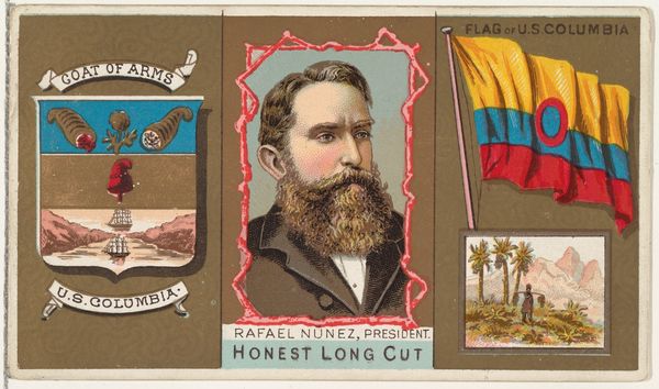 Editor: This is a peculiar piece! "Governor Stevenson, Nevada," part of the "Governors, Arms, Etc." series by W. Duke, Sons & Co., dating between 1885 and 1892. It appears to be a print with drawing and watercolor elements. What really strikes me is its division into three distinct scenes – a governor's portrait flanked by scenic elements – almost like a triptych turned sideways. What do you see in this curious convergence? Curator: Ah, yes, quite right! These tobacco cards, mass-produced as collectible items, offer fascinating insights. This one captures a moment of pride in Nevada's identity, presenting a governor, the state's coat of arms, and, unexpectedly, a quarantine flag! What does the presence of the Quarantine flag bring to mind for you? Editor: Honestly, a little historical anxiety! Knowing that this was created pre-antibiotics makes the mention of 'quarantine' rather grim. But there's this contrast with the portrait and the Coat of Arms that shows development and strength. Curator: Precisely. There’s an optimism intertwined with a stark reminder of vulnerability and the efforts toward control and order. See how the industrious "Silver Train crossing Mountains" reflects human endeavor set against the wild landscape? These objects acted as conversation starters, pocket-sized reflections on civic pride and state identity. Almost a very brief view into local current events of the day! Editor: So it’s less about high art, and more a mirror reflecting the daily life, pride and fears of a time? Curator: Exactly! Think of it as a miniature time capsule, offering us a peek into late 19th-century American culture. A small format delivering powerful, and somewhat contrasting, messages! I love these little vignettes of life. Editor: I never thought a cigarette card could reveal so much. Fascinating!