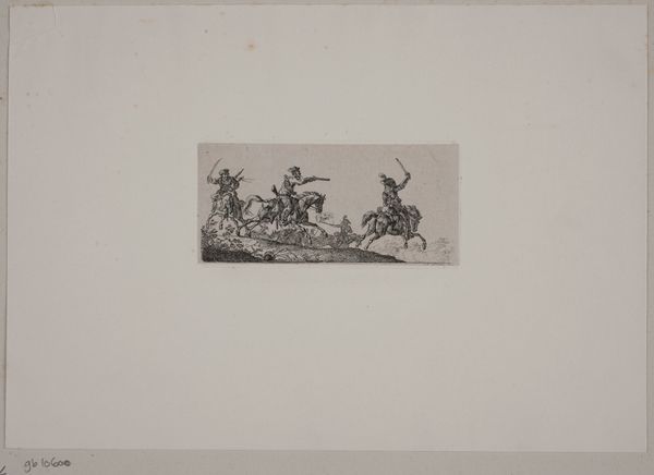 Editor: So, here we have G.V. Blom's "Ritter, tot und teufel" from 1898. It’s an etching, ink on paper... feels like a dark, satirical fairy tale. The composition's pretty stark. What do you see in it? Curator: Ah, Blom's take on mortality, eh? This image dances on a precipice where life and death become partners in some absurd charade. To me, it’s like witnessing a bizarre street parade where Death is the ringmaster, leading a somewhat tipsy knight astray, accompanied by, perhaps, our inner demons embodied. Editor: Tipsy is a good word for it. The knight looks... not so noble, actually. He's sort of slumped on the horse. Curator: Precisely! And the horse itself looks weary, resigned to its role. Look at the lines – scratchy, frantic even. Blom's isn't trying to depict beauty. It is the opposite, no? Rather, it’s laying bare a raw nerve, the discomfort we feel when confronted with our inevitable end. Do you find any comfort at all? I don't! Editor: Not really comfort, no. But maybe a little bit of recognition? That life is a little bit absurd? Curator: Exactly. It is funny, maybe. Editor: That's great. I didn’t see that at first. I was so focused on the morbid aspects. It has layers to it. Curator: And those layers are what make art worthwhile, right? Not just pretty pictures, but windows into the human condition. This definitely sparks a dialogue, a dance between the grim and the slightly, darkly humorous. Editor: Absolutely, I’m definitely going to remember this artwork now. Thanks.