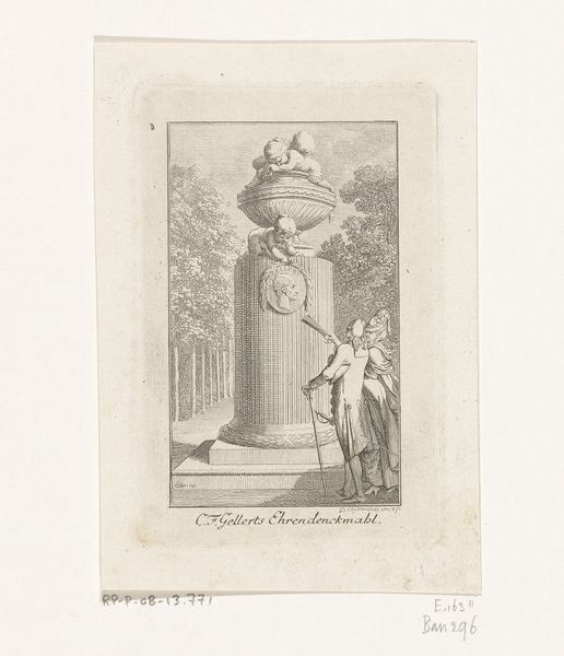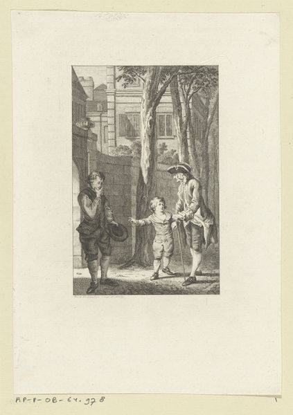 Curator: This is F. Herinck's "Spelende kinderen voor de ingang naar een park," dating to 1863, an engraving printed on paper. Editor: My first thought? A stage. The gateway feels like a proscenium arch, framing this brief burst of childhood chaos. There's a dreamlike quality, wouldn't you say? Curator: Indeed, but let’s consider the material conditions. The engraving process itself necessitates a careful, methodical labor. It suggests a world increasingly reliant on reproducible imagery, of which prints were a crucial component in the 19th Century. It allowed for a wide distribution. Editor: True, there’s a craft to it. But what captures me is how Herinck renders that ephemeral energy of children playing, even with a stiff, demanding medium. Did he see this often, do you think? Those fleeting moments? Curator: Possibly. Genre scenes like these had a market; depictions of everyday life allowed burgeoning bourgeois audiences to reflect upon themselves. And parks themselves, gaining in prominence during this time, reflected changing attitudes toward public space and recreation. The print speaks to that social dynamic, doesn't it? Editor: Certainly. It's more than just kids larking about. There’s the contrast between the neoclassical sculptures—symbols of idealized, frozen grandeur—and the messy, imperfect reality of youth. The adult figures, standing watch, emphasize that divide too. A nice counterpoint. Curator: And notice the architectural rendering, indicative of neoclassicism, a conscious effort to connect with antiquity as a legitimization tactic during state building in post-Napoleonic Europe. Also, let us reflect that engravings are also an implicit form of capitalism through sale of product, each reproduction offering the artist an additional fractional value. Editor: A little cynical perhaps. Art for the marketplace, yes, but it is lovely. Even just now thinking, that quality... That balance makes it quite alive. Curator: I agree! A fine specimen for deeper inspection and thoughtful contemplation of life during that period. Editor: Absolutely, it is evocative isn't it? And full of story, I would suggest, ripe for pondering!