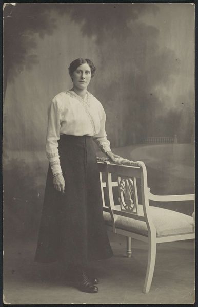 Editor: So, here we have a vintage photograph, titled "Portret van een vrouw in een rok met knopen en een blouse, zittend," or "Portrait of a woman in a skirt with buttons and a blouse, sitting" dating back to around 1915. It's part of the Rijksmuseum collection, created by American Automatic Fotografie. The photo itself has this incredible, staged theatricality about it... It feels like a snapshot from a play. What story do you think this image tells? Curator: That staged feeling is key. Consider the democratization of portraiture in the early 20th century. Photography became more accessible, moving outside the exclusive realm of the wealthy. Studios like "American Automatic Fotografie" offered ordinary people the chance to participate in image-making, in crafting a public self. Note the backdrop: a painted landscape, the stylized furniture. This isn't simply about recording a likeness; it’s about performing an identity, participating in aspirational social mobility. Why do you think such portrait studios become popular during this period? Editor: I guess it offered a chance for people to create a certain image of themselves that they couldn't otherwise achieve? To participate in some sense of status? Curator: Precisely. It’s about constructing a narrative. The woman’s attire, while modest, is carefully chosen. She is not wealthy, but she wishes to be seen as refined. These mass produced photographic portrait studios provide a new opportunity. The public consumption and creation of images dramatically changes. Editor: That's fascinating! It makes you wonder how self-aware she was being, consciously participating in crafting her identity through the photo. And the backdrop… it feels almost like an early version of Instagram filters. Curator: Exactly! This studio backdrop serves a similar function of constructing a desirable if artificial context around her portrait. This helps frame our understanding of photography's changing role in society. Now, are you starting to think of portrait photography differently than before? Editor: Definitely. I was initially focused on the image itself, but now I see the bigger picture about how people used photography to present themselves in a rapidly changing world. It's far more than just a portrait, it's a socio-cultural document!