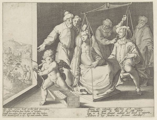 Curator: This engraving, "Musicerende selskab akkompagneret af Tiden" from around 1600 by Gillis van Breen, really speaks to the societal norms of its time, doesn't it? Editor: It’s interesting, a scene of leisure! The figures are grouped around a keyboard instrument with one playing the lute, and overall it gives me a strong sense of, well, indulgence. What jumps out at you when you look at this print? Curator: What interests me most is how it critiques this very indulgence. The figure of "Time" lurking in the background suggests a commentary on the fleeting nature of pleasure, typical of Baroque vanitas themes. How do we read the presence of Time in relation to social class? Do you see the warnings embedded in this portrayal of leisure? Editor: That makes sense. I hadn't considered the lurking figure of Time as a critique but, looking at it again, it definitely casts a shadow over the scene of musical entertainment. But I'm curious, what does situating it within a broader narrative of class tell us? Curator: Well, think about who has the privilege to engage in leisure, in musical pursuits. It's not the working class. This image can be interpreted as a subtle reminder of mortality aimed at those in positions of privilege. The scene appears to normalize a world of class differences, even as the allegorical figure reminds the elite of inevitable change. Editor: So, it's not just a scene of music, but also a reminder about societal inequalities and, you’re right, who has the luxury of ignoring time. Curator: Precisely. And remember, art is never neutral. Even seemingly straightforward depictions of daily life are imbued with ideology and power dynamics. Editor: That’s a great point. Thanks, it has really changed how I see it now. Curator: Indeed! Looking at art with a critical eye always unveils new layers of meaning.