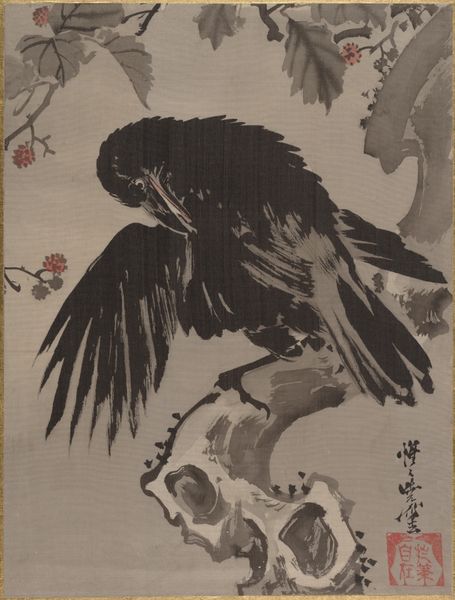 Editor: So, here we have Kawanabe Kyōsai's "Two Crows on a Pine Branch," likely created between 1877 and 1897, using ink. There’s something almost confrontational in the crows’ gaze; they seem to challenge the viewer. How do you interpret this work? Curator: What immediately strikes me is how these crows, typically harbingers of change and disruption, perch upon a pine – a symbol of longevity and steadfastness. What tensions might this juxtaposition reveal about Meiji-era Japan? The rapid Westernization was perceived by some as a threat to traditional Japanese identity. Could these crows embody that unease? Editor: That's interesting. I hadn't thought about it that way. I was just focused on the rather bold and stark nature of the ink work. Curator: Exactly. And notice how the boldness also defies the delicate aesthetics often associated with traditional Japanese art. Think about how Kyōsai used his art to critique power. Do you see these crows as passively observing, or actively judging? Editor: Hmm… judging, maybe? Especially given the directness of their stares. It feels like more than just observation. Curator: Consider also the social implications of portraying such a common bird so prominently. It challenges traditional artistic hierarchies that favored noble or aesthetically "pleasing" subjects. Kyōsai, known for his rebellious spirit, frequently used folklore and common imagery to challenge the elite. What’s stopping us from seeing this piece as a subversive act, cloaked in traditional form? Editor: That makes the image much more powerful. I see the crows now less as just birds and more as symbols of dissent. Curator: Indeed. By bringing together symbols and historical context we reveal a layered understanding that helps us relate artworks such as this to complex ideas about gender, class, race, and cultural identity, past and present. Editor: I'll never look at crows the same way again! Thank you for highlighting that crucial aspect.