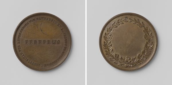 Curator: Here we have a medal, or 'Prijspenning', from the 23rd National Agricultural Congress Exhibition in Kampen, dated 1869. It’s attributed to David van der Kellen. Editor: The materiality is really striking. The smooth, almost worn metal surface—bronze perhaps—it gives such a tactile impression of history. There's a coolness to it, both visually and physically, almost demanding to be held and examined closely. Curator: Yes, its purpose as a commemorative medal places it firmly within the tradition of bestowing honors. Consider what this object signifies in terms of social structures and recognition of agricultural advancements in the late 19th century Netherlands. These congresses were critical in disseminating knowledge and shaping policy, this object representing that dissemination of knowledge through the production of a tangible object. Editor: Absolutely. I see the wreath and the emblem at the top—it speaks volumes about value being placed upon land and the work required to cultivate it. The craftsmanship itself is subtle, yet carries this clear message, suggesting pride and a material connection to the earth. The labor involved in the medal’s creation, contrasted against the agricultural labor it celebrates, is compelling. It speaks volumes about class, artistry, and purpose all coalescing. Curator: Indeed. The medal also connects to the rise of national institutions and professional societies and reflects a burgeoning sense of national identity tied to agricultural success. Editor: I love how a seemingly simple object encapsulates such complex social relationships around labor and material culture. The deliberate choice of materials and design to imbue it with a sense of prestige... it all resonates today. Curator: Ultimately, this 'Prijspenning' speaks to the intersection of art, industry, and society, revealing much about the values of its time. Editor: It certainly provides a tangible way to reflect on the way material objects embed history and class, all at once!