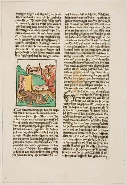 Curator: We're looking at a woodcut called "The Holy Father Theona in his Cell in the Wilderness; Theona Converting Thieves." It's an anonymous work from around the 16th century, part of the Harvard Art Museums collection. Editor: It feels like a comic strip from a fairytale! The colors are simple but the figures are really expressive. I’m instantly drawn to the narrative quality, almost like a page out of a storybook. Curator: Indeed. The woodcut depicts two scenes from the life of Father Theona. In one, he's visited by a group seeking healing. In the other, he's converting thieves to his holy faith. Both are occurring inside and outside of his wilderness cell. Editor: The thieves really grab my attention. They’re coming to him to change their ways, but it's also a statement about the transformative power of faith and redemption. Curator: It's interesting to note the contrast between the wilderness setting and the implied sophistication of converting thieves. Theona, isolated yet influential, becomes a beacon. Editor: It's such a simple image, yet it speaks volumes about faith, healing, and the power of transformation in unexpected places. A story of the human spirit, in its most vulnerable, and hopeful state.