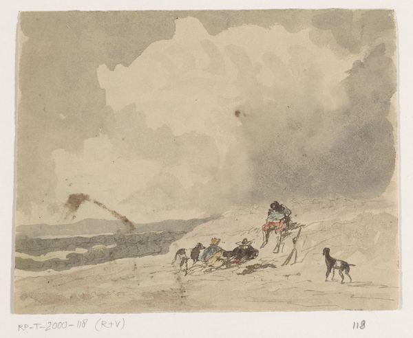 Editor: This watercolor, "Le Petit Journal," by Philip Connard, shows figures on a beach. It feels so light and airy, almost like a fleeting memory. What do you see in this piece that might not be immediately obvious? Curator: It's a lovely observation. Connard captures the essence of leisure, doesn’t he? For me, it whispers of simpler times, perhaps a Edwardian summer afternoon where reading "Le Petit Journal" was the height of excitement. Have you noticed how the figures are suggested rather than defined, melting into the scene? Editor: Yes! They're almost ghosts. Is that intentional, do you think? Curator: Perhaps. Or maybe it’s Connard reminding us that even the most vivid moments fade. The beauty lies in the transience. What do you think? Editor: I hadn't considered that. It makes the whole scene much more poignant. Curator: Exactly! Art is a bit like that, isn’t it? A conversation with the artist, across time and perception.