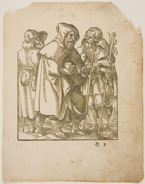 Editor: This anonymous woodcut, "Five Jewish Doctors in a Room," made in 1483, has a peculiar depth created by the architecture. What do you make of the composition? Curator: The stark lines and their arrangement within the frame are quite compelling. Note how the artist uses varied line weights to suggest depth. The figures appear compressed, almost claustrophobic. Editor: Yes, I see that now! The linear perspective seems flattened. What might that suggest? Curator: It disrupts a seamless reading of space, highlighting the materiality of the print itself. The lines don't just depict figures, they *are* figures, constructing the image's reality. Editor: So, the medium is the message? Curator: Precisely. It's a powerful statement about representation itself. I hadn't considered it from that angle before; thank you for that observation.