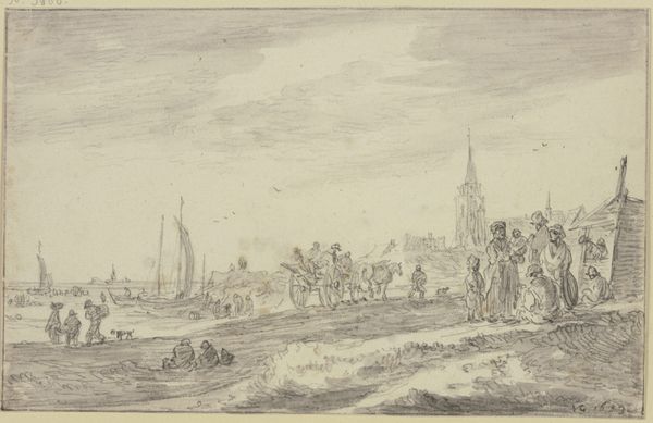 Editor: This is "A Fair," a pen and pencil drawing by Jan van Goyen, dating back to 1653. It feels very much of a moment, like a snapshot in time of a bustling marketplace. What strikes you when you look at it? Curator: The density of figures certainly pulls the eye, doesn't it? I see this work as a window into the social fabric of 17th-century Holland, a visual record brimming with cultural information. Note the church tower in the background; what significance might that have in relation to the fair? Editor: Perhaps a sanctioning of the community activity? Or just a familiar landmark? Curator: Precisely. The Church's silent witness reminds us of the interwoven nature of the sacred and profane in everyday life. What about the placement of the figures— notice how the eye travels through the composition. Are they simply placed, or do they represent different strata within society? Editor: I see figures on horseback, which I assume denotes a higher social position, and then there are those arriving by boat, perhaps merchants or visitors from out of town. The array of stalls also suggests a variety of goods and services being exchanged. Curator: Yes, indeed! The objects, the figures themselves – each detail contributes to a symbolic understanding of the economic and social dynamism of the time. Van Goyen captures a moment that reveals a larger story about Dutch society, and its ambitions. What do you make of the rapid, almost frantic linework in the drawing? Editor: I guess it conveys a sense of energy, but perhaps also speaks to the transient nature of the fair itself. Curator: It echoes, I believe, the fleeting nature of human activity and prosperity, a subtle reminder within the celebration. Food for thought, certainly! Editor: Definitely something to ponder. Thanks!