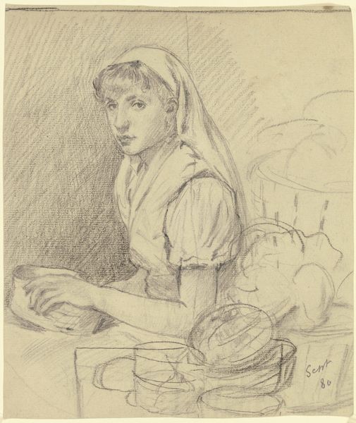 Editor: Here we have "Greengrocer," a pencil and chalk drawing from 1880 by Otto Scholderer, currently held at the Städel Museum. There's something so delicate and immediate about the sketchiness of it all. The woman looks very contemplative. What catches your eye when you look at this piece? Curator: Oh, I'm immediately transported, aren't you? It feels like stepping into a forgotten corner of a bustling marketplace, somewhere in old Germany maybe. You know, I see a woman caught in a moment – perhaps counting her earnings, or maybe just daydreaming amidst the cabbage. And that light! See how Scholderer coaxes the light out of the pencil and chalk? It’s like the drawing itself is breathing. The woman seems so quiet. I almost wonder what she is thinking. Do you get a sense for her mood? Editor: I feel she is tired, perhaps bored? Curator: Boredom, now there’s a thing. So often we look for grand narratives, for sweeping statements, but maybe Scholderer is showing us the beauty, or the melancholy, of the everyday. The woman, is she defined by her work, or is there something more there, in the shadows and the light? It's almost like he wants us to question our assumptions about the working class. Editor: That's a great point. It really invites you to create your own narrative for her. I hadn't considered that aspect of social commentary. Curator: Art often holds up a mirror, doesn't it? And sometimes, what we see reflected is less about the subject and more about ourselves. Editor: I like that a lot. It's funny how a simple drawing of a greengrocer can reveal so much. Curator: Indeed. A humble subject, elevated through the artist's vision and perhaps by our own musings.