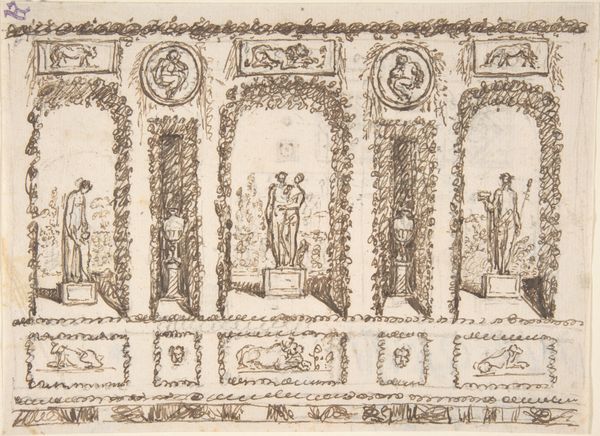 Curator: Oh, wow, look at this wispy, almost ethereal sketch! It’s so light, barely there, like a forgotten dream of grandeur. Editor: Indeed. We are looking at a work titled "Design of an Architectural Monument (Tomb?)," a drawing likely created between 1850 and 1880 by an anonymous hand, held here at the Metropolitan Museum of Art. It appears to be rendered in pencil and watercolor. Curator: Tomb, huh? Makes sense. There's this pervasive sense of hushed reverence, and also maybe a little bit of decay. The incomplete parts add to that feeling, like it's slowly dissolving into the paper. Editor: I’m struck by the anonymity of its maker. How many unrecognized artists and designers contributed to the architectural landscape of that era, only for their work to remain uncredited? Curator: It’s a ghost story in pigment, right? I’m seeing echoes of Renaissance architecture, but also a unique, almost haunting interpretation. Those arches! It looks a little bit Roman. Editor: The drawing merges Renaissance sensibilities with a possibly Neoclassical vision, reflecting the revival of classical forms in 19th-century architecture. I imagine a designer, grappling with how to reconcile past glories with contemporary needs, thinking of course, of legacies and the monumentalization of power through architecture. Curator: You said 'power,' and suddenly I see this in a whole new way. Was this design actually intended as a monument of power, maybe celebrating wealth, legacy and influence? This impacts our view as contemporary viewers. Editor: Absolutely, and further we can note that monumental architecture historically enshrines patriarchal systems and reinforces societal hierarchies, often silencing marginalized voices. It invites us to examine whose stories are deemed worthy of being memorialized, and at what cost. Curator: Huh. It makes you wonder if that original architect wrestled with that same question. This sketch makes you see more than you thought you would see! Editor: Precisely. By confronting the monument’s historical implications, it forces a critical engagement with power, narrative, and our collective responsibility to represent history with inclusivity.