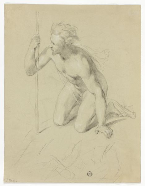 This drawing, "Standing Male Nude with Staff," was made by an anonymous artist using graphite and black chalk on paper. Notice the artist's careful handling of the materials. The graphite and chalk have been layered and blended to create subtle gradations of tone, capturing the play of light and shadow on the figure's body. The drawing's realism reflects the artist's skillful technique, yet the choice of a nude male figure with a staff also evokes classical ideals of beauty and strength. The act of drawing itself, with its emphasis on close observation and meticulous rendering, speaks to a tradition of academic training and artistic refinement. It reminds us that even seemingly simple materials like graphite and chalk can be used to create complex and meaningful artworks, blurring the boundaries between craft and fine art. It is a testament to the artist's skill and the enduring power of the human form.