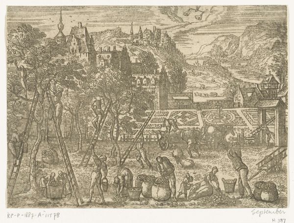 Curator: This is "Juli," an etching by Pieter van der Borcht, made sometime between 1545 and 1608, currently held at the Rijksmuseum. Editor: The busyness of the scene really strikes me. All those figures and buildings fill the whole frame. How do you approach a work with so many visual elements? Curator: I look closely at how the artist organizes those elements. Notice how the artist utilizes horizontal registers to separate the foreground, midground, and background. This gives the artwork its structure. Semiotically, the field workers are the signs, in the sense of units of meaning in the foreground of this semiotic schema. Editor: I see what you mean about the structure. The horizontal bands separate activities in a cohesive manner. How do we assess Pieter van der Borcht's landscape style? Curator: Observe the balance. The city recedes, but is vital to understand this scene is cultivated, not wilderness. Are you noticing any rhythmic repetition of form and figure? Editor: Well, all the figures use similar tools in different postures to advance their work of harvesting crops, a pattern. But is it meant to underscore an ideological stance? Curator: Is it about something exterior or interior? Look at the composition again; ask yourself: Is it unified, balanced? Does the landscape feel contained or boundless? Focus on what’s visibly there, the orchestration of lines, forms, and tones within the pictorial field. It presents to us what must have been everyday reality. Editor: I guess by isolating form, repetition and tone, the structure hints at routine and hard work. Thank you, I learned to scrutinize forms without over interpretation. Curator: And I was reminded how semiotic and structuralist analyses give such descriptive power to art!