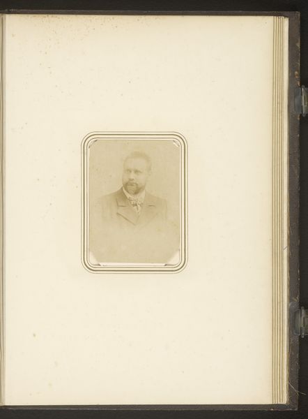 Curator: This portrait just draws you in, doesn't it? Such directness. Editor: Absolutely. It has that starkness that often comes with early photography. It's as if the sitter knew the importance of leaving a record of their existence. This albumen print, dating from somewhere between 1861 and 1880, is titled "Portret van een man met baard," currently held in the Rijksmuseum collection. Curator: I'm immediately drawn to his expression. The gaze is intense but also slightly melancholic. What stories is he holding back? Editor: I see your point. There's a weight there, a gravitas. It speaks to the rise of the bourgeois class in Europe at that time and the desire for legitimacy, respectability, and remembrance in the face of massive cultural change. A physical and social ambition visualized here with photography. Curator: And that meticulously groomed beard. Facial hair became such a powerful symbol of masculinity and authority in the 19th century. Editor: Indeed, and let's not overlook the clothing; the jacket looks freshly made for a solemn representation that shows both wealth and dignity. It speaks to both class and aspirations, but on the other hand, realism was arising strongly as a movement during those years, and the photographic medium becomes an ideal channel for that intention. Curator: I wonder, though, how aware he was of all those implications? Did he feel burdened by them, or empowered? Editor: Perhaps a little of both. The image reflects not just his personal identity but also the aspirations and anxieties of a whole social class at a transformative point in history. Also, note the framing of the shot itself: this ovoid vignette on an off-white page. Do you consider that symbolic or mere decor? Curator: Everything counts. The shape is like looking into an intimate past, or a memento. Editor: Ultimately, what this portrait offers is a window into a specific moment in time—a collision of personal identity and historical forces. It prompts us to think about what traces we leave behind and how future generations will interpret them. Curator: Precisely, it's more than just an image of a man with a beard; it’s an enduring question. What remains when we’re gone?