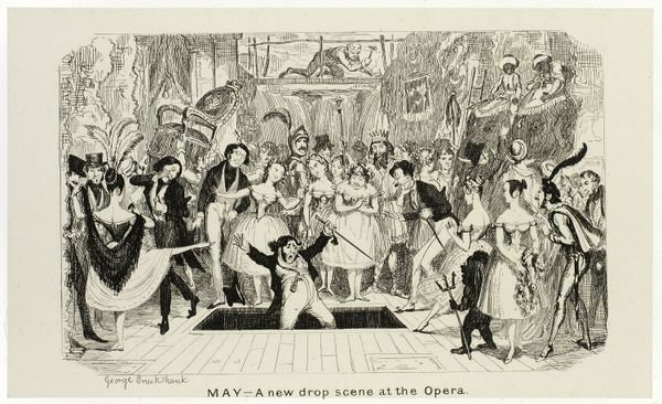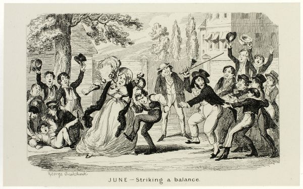 Editor: So this is "July - Down at Beulah from George Cruikshank's Steel Etchings," a print made sometime between 1840 and 1880. It’s an etching on paper by George Cruikshank. It looks like quite a chaotic scene, everyone is cramped into a small space. What first strikes you about it? Curator: It throws me right into the whirlwind of a bustling summer scene, doesn't it? Almost like stumbling upon a rowdy party in a teacup. There's this palpable sense of… well, barely-contained frenzy. Everyone is pushing to their own beat and almost on top of each other! Does it spark a feeling or memory in you? Editor: Definitely, I'm getting the sense of barely contained chaos, like at a family gathering that has gone on just a little bit too long. It seems like commentary on social life and class, am I right? Curator: Precisely! Cruikshank, bless his satirical heart, was a master of skewering social norms. This etching comes from a series published in "The Comic Almanack," meant to humorously depict everyday life through the lens of caricature. What details jump out that seem a little... exaggerated? Editor: I mean, look at the expressions. Everyone's got these wild, over-the-top expressions and poses! The proportions seem… off, like in a funhouse mirror. It definitely adds to the feeling of this tipsy and absurd situation. Curator: Absolutely! That deliberate exaggeration isn't just for laughs; it's a way of calling attention to the absurdities and hypocrisies that Cruikshank saw in society. What does that seated fellow nursing his head seem to suggest to you? Editor: A lot of excess got him into that position! I didn’t catch the “Beulah Spa” sign in the background, it adds a bit of context, knowing it's a real place. Curator: Ah, that little detail is a key! Beulah Spa was this fashionable, or maybe trying-to-be-fashionable, spot in London, known for its supposed medicinal waters. The image suggests this blend of real life, caricature, and social critique! I wonder if any social spas will leave such art for the next generation? Editor: That’s fascinating. Thanks! I'll definitely look at Cruikshank’s work with new eyes now.