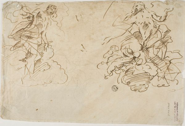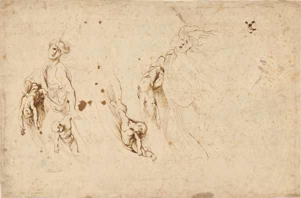 Curator: This drawing, "Two Figures: Nude Youth on One Knee, Man Standing with Left Foot Raised," is attributed to an anonymous artist and dates roughly between 1600 and 1700. It's rendered in sanguine, that beautiful red chalk, offering us a glimpse into artistic practice of the period. Editor: The first thing that strikes me is the raw energy in the nude youth’s pose—almost as if he’s mid-struggle. Compared to the static, draped figure on the right, there's a distinct tension, wouldn't you agree? Curator: Absolutely. Consider that the male nude held a central role within academic art. It was the body, ideally proportioned, yes, but also it signified status, virtue, physical dominance… it was, shall we say, carefully presented. This dynamic rendering departs from conventional idealism, and suggests more nuanced or perhaps less resolved concepts. Editor: Interesting. The tension extends beyond the figures themselves. I find it compelling to ponder their relationship, or the narrative implied but not explained. Is it resistance? Entreaty? And given the classical allusions, are we meant to examine issues of class, strength and societal expectation, then and now? Curator: Yes, and note the contrasting rendering. The nude youth is vibrant and immediate while the figure with drapery on the right has a classical detachment about him. In some ways they challenge social power by challenging those long-held artistic traditions. Editor: It's in the very gesture, too, that reaching arm on the nude. Does the artist capture some nascent concept of free will, through bodily expression? We cannot ignore what this type of representation suggests about social norms. Curator: We shouldn't forget this piece's possible origin within the academy. A life drawing could have offered safe opportunity for students and others associated with a certain class to observe and idealize this youthful strength. Its purpose wasn't only anatomical. It was the observation of hierarchy itself. Editor: Exactly. The layers of meaning are complex and often contradictory. What appears traditional may disrupt norms. We are left pondering, in what contexts can an image possess such a range? Curator: It does make one appreciate the enduring power of even the most simple looking artistic expressions and practices from our shared past. Thank you for helping us bring it to life. Editor: My pleasure. It reminds me how vital it is to consider the stories art holds and to remain critical of the many powers invested in these beautiful but sometimes loaded artifacts.