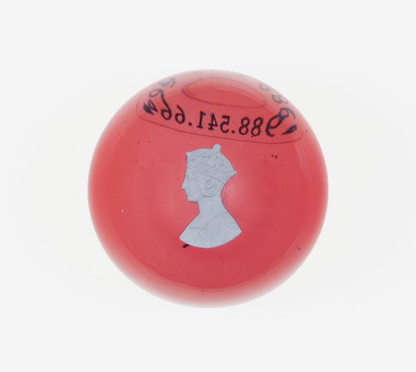 Curator: So, what captures your attention about this glass paperweight? Editor: Well, this "Paperweight," likely created between 1850 and 1900 by the Clichy Glasshouse, feels very intimate to me. Encased in glass, a white portrait almost floats in the object, with what looks like a reddish, or maybe burnt-orange backdrop. The details are captivating; it feels like more than a decorative object. What is your perspective? Curator: That sense of intimacy you identify is crucial. Who had the privilege to be immortalized in such a delicate and costly object? What was the power dynamic? We have a portrait of a bearded gentleman enshrined. Was this about familial legacy, patriarchal structures, or social aspirations of the middle class during the Industrial Revolution? This era cemented power structures in ways that still echo today. This work reflects those systems and who was able to be remembered, or even elevated, through craft. Editor: I never thought of it that way. I saw this paperweight as a simple objet d’art. It’s interesting to consider it reflecting those entrenched social hierarchies. So the artistry on display isn't separate from those political underpinnings? Curator: Exactly! What we often perceive as mere decoration or craft is inherently linked to broader social and political landscapes. Who has the power to commission, to create, and to be represented? These are all valid lines of questioning that can shape how we read this paperweight today. And, more importantly, helps us question assumptions embedded in seemingly innocuous everyday objects. Editor: I now have so much more to think about when approaching similar artworks in the future. Considering whose stories are prioritized is an important lens. Curator: Indeed. Always look beyond the surface and question the narratives embedded within the art and culture that surrounds us. It allows us to think critically about the present, too.
