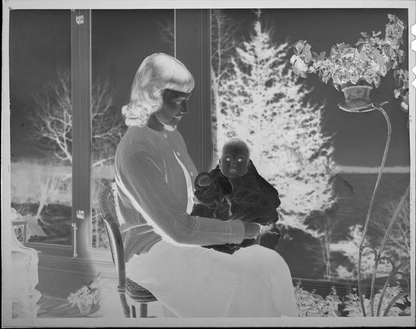 Curator: This photograph, "Untitled (mother and grandmother with newborn)" by Lucian and Mary Brown, presents a rather stark, negative image of three generations. It's roughly 10 by 13 centimeters. Editor: It has a ghostly quality, doesn't it? The inverted tones create this ethereal atmosphere, as if we are witnessing something deeply private, yet slightly removed. Curator: The composition is intriguing. The mother, in profile, holds the child while the grandmother looks on, partially cropped. It suggests a continuity and transition of care. Editor: The absence of a specific date pushes it into a more universal realm. It becomes less about a specific family and more about the broader themes of motherhood, legacy, and familial bonds. Its display feels deliberate, almost staged. Curator: Indeed. The way the figures are arranged against the window and garden is a visual statement itself. Editor: Precisely. Despite the initial starkness, there is a tenderness conveyed through the arrangement of figures. This photograph allows us to see through the formalism of light and shadow. Curator: And to understand the symbolic value of this photographic negative.