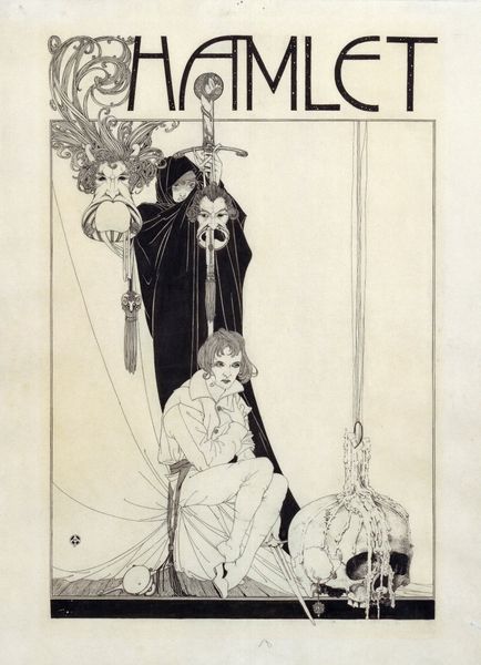 John Austen created this drawing, Hamlet, using ink, demonstrating his masterful control over line and form. The composition, tightly framed, draws us into a scene dominated by intricate patterns and stark contrasts of black and white. The density of lines creates a rich texture, inviting a close visual reading. Austen uses a semiotic system where each element signifies more than its mere appearance. Hamlet, cloaked and centered, is framed by players on either side, and a nude child-like figure with mask motifs which create layers of symbolic depth and a theatrical atmosphere. The formal qualities of the piece—the balance of light and shadow, the deliberate arrangement of figures—reflects broader artistic concerns of the period, particularly the exploration of psychological states through visual means. Notice how Austen destabilizes traditional interpretations of Shakespeare’s play. The graphic approach suggests the character’s multiple layers and the complexity of the human condition. This Hamlet is not static; it’s a dynamic interplay of form and meaning.