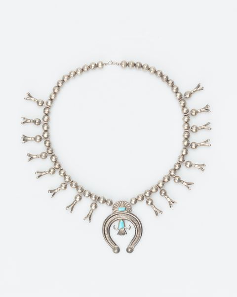 Editor: This is a Navajo necklace made of silver, dating from around the 1950s. It's quite striking – a strand of small silver beads adorned with crescent and star-like pendants. The silver gives it a subtle shimmer. How would you interpret this work within its cultural context? Curator: Seeing this, I immediately think of the interplay between tradition and adaptation. The mid-20th century was a period of increasing interaction between Navajo artists and the broader American market. The Diné, like many Indigenous groups, faced pressures to conform to external aesthetic expectations while also preserving cultural identity. Do you notice any elements that suggest a negotiation of these forces? Editor: Well, the use of silver suggests a connection to traditional Navajo jewelry making, but the stylized crescent and star motifs seem almost… contemporary, or at least simplified. Curator: Exactly. The raw material links it to longstanding Navajo artistry. However, the simplified motifs and potentially their repetition speaks to the demands of a wider market. What public role do you think these adornments fulfilled beyond simple personal beautification? Editor: Hmm, perhaps it's a symbol of cultural resilience? Maintaining artistic practice in the face of assimilation. Or even a form of economic self-determination, selling these pieces allows agency. Curator: Precisely. Navajo jewelry wasn't just decorative; it carried cultural weight. Pieces such as this played a role in shaping outside perceptions of Navajo artistry, impacting representation, and fueling an art market where issues of appropriation always lingered. It’s essential to consider this necklace not in isolation, but within this history of cultural exchange and the politics of representation. What have you gained after analyzing this work? Editor: It's fascinating to think how a piece of jewelry embodies all those layers of history, negotiation, and cultural identity. I had not thought of economic empowerment playing such an integral part. Curator: And it pushes us to consider the broader context of Indigenous art production and reception. Hopefully more work such as this could promote a public role for art.