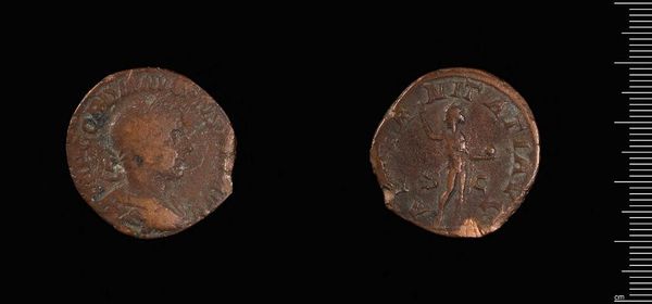 Curator: Here we have an Antoninianus of Tetricus II, a small coin held in the Harvard Art Museums. The coin, made of bronze, feels incredibly worn, doesn't it? Editor: Indeed. It speaks of its age and journey, hinting at the hands it passed through and the pockets it resided within. I am curious about what economic and social power this object conveyed to its users during that time. Curator: Absolutely. As a coin issued by Tetricus II, who briefly co-ruled the breakaway Gallic Empire, it represents not just currency, but a claim to legitimacy and sovereignty during a period of intense political fragmentation. Editor: I see the imperial portrait on the obverse and what looks like a figure on the reverse. The wear obscures the details, yet somehow that erosion contributes to its narrative. It's a tangible link to the economic infrastructure of a volatile empire. Curator: Exactly. The coin offered a material, if small, form of belonging to the people. These objects acted as propagators for particular imperial ideologies. Editor: Considering its humble composition and form, it’s amazing how powerfully this little coin demonstrates the intricate connection between political power and everyday life. Curator: It really is, reminding us how even the smallest of objects can speak volumes about identity and power.