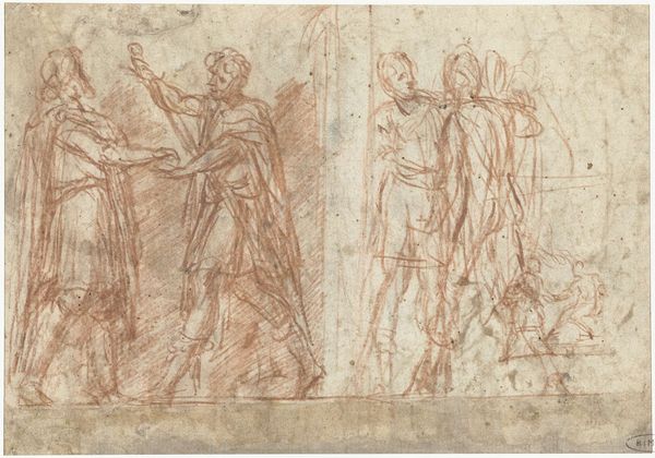 Editor: Here we have an intriguing piece from somewhere in the 17th century – a drawing called "Scene of a Baptism of a Woman by a Bishop with Onlookers." It's Anonymous's work, and they’ve used pen, ink, charcoal, and what looks like toned paper to depict this moment. It feels very immediate, almost like a fleeting sketch capturing a solemn event. What jumps out at you when you look at this, given your art expertise? Curator: You know, the "fleeting sketch" feeling is spot on, it resonates as more than a record; I see a palpable exploration of faith and ritual in a single go, rather than something carefully staged. Note how the artist hasn't labored to resolve the composition at its edges; they really draw us toward the figures engaged in baptism. The bishop seems weighty with responsibility, but look at the onlookers – do you notice the different reactions they depict, from solemn observance to perhaps even… skepticism? How do you see them? Editor: Yes, there is definitely something questioning in their looks, and there are even sketchy doodles as if to break the somber mood. So it seems almost irreverent, considering the occasion? Curator: Irreverent might be a touch strong, although the loose handling of the materials could be misinterpreted, and it's this ambivalence, perhaps, that truly gets under my skin. I imagine this was meant for preparatory work— but seeing this makes me wonder what happened to the final piece! What a wonderful emotional texture, a captured fragment of doubt coexisting with devout practice. What does it tell you about your beliefs and presumptions when viewing this piece? Editor: The idea of doubt mixing with faith is very striking, especially as a modern viewer, that tension feels incredibly relevant, thank you. I feel that now, in an art historical context, maybe doubt is the more honest way to represent anything meaningful and authentic? Curator: Beautiful point! That emotional honesty shines even through these antique inks and papers and speaks loudly to our age. I see the spark of something true— and sometimes uncomfortable— resonating between that scene from so long ago and us today.