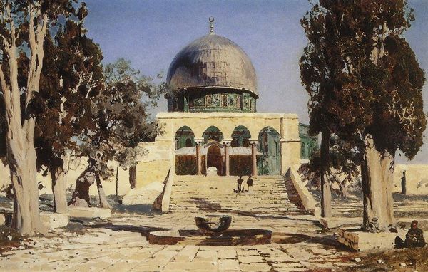 Tivadar Kosztka Csontvary created this painting, "View of the Dead Sea from the Temple Square in Jerusalem", using oil on canvas. At first glance, the buildings dominate the foreground, leading our eyes to the distant Dead Sea. The domes and varied architecture of Jerusalem create a captivating landscape. The linear perspective focuses attention on the mosaic of human activity that the city represents, highlighting the structural arrangement of shapes and forms. Csontvary uses sharp, precise lines, that define each structure, and a palette of earth tones juxtaposed with areas of bright blues and reds, creating a unique visual tension. This tension can be seen as a metaphor for the historical and religious complexities which characterise Jerusalem. Note the contrast between the rounded domes and the rigid geometry of the buildings, which suggests a dialogue between organic and man-made forms. The interplay of light and shadow on the architectural surfaces invites us to consider the painting's deeper symbolic meanings, inviting viewers to find their own truths in the landscape.