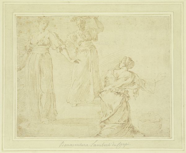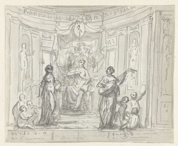 Editor: So, this is "Cybele and Three Attendants," an etching by Antoine Léonard Du Pasquier from 1801. The scene feels like a classical frieze, all flowing drapery and serene figures. The composition is balanced, almost rigidly so. I'm curious, what does this artwork evoke for you? Curator: What strikes me immediately is the conscious revival of classical imagery during a time of immense social upheaval in France. Neoclassicism, as an art movement, served a very specific purpose: it invoked the perceived stability and order of ancient Rome and Greece. Think about it – why depict Cybele, a Phrygian goddess associated with fertility and nature, at this particular historical juncture? Editor: That’s interesting. It’s more than just aesthetic; there's a political undercurrent? Curator: Precisely. It's about crafting a visual language that implicitly comments on the socio-political landscape. These images gained currency not solely within art institutions, but as instruments in civic rituals. Notice the setting itself—the women perform some service. To whom are they dedicating their ritual? How do representations of women—particularly powerful goddesses—function in shaping public perception of ideal virtues, of order, of society itself? Editor: It sounds like Pasquier wasn't simply drawing inspiration, but actively participating in a larger cultural narrative. I always viewed neoclassicism through a purely art-historical lens. But your approach has given me much food for thought on how artistic choices often resonate with their own place and time, that their impact goes beyond the museum. Curator: Indeed. By questioning the motives and contexts surrounding art's creation and reception, we can arrive at a more enriched and informed reading. It really gives one pause to reflect on these forces and the social function of the work itself.