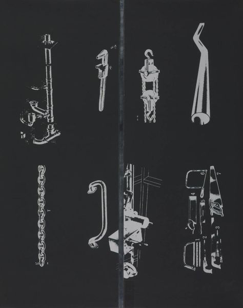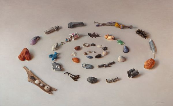 Curator: At first glance, this feels like a very sterile still life. Almost like a product catalog. Editor: Indeed. What we have here is Lisa Milroy's "Light Bulbs," part of the Tate Collections. Milroy, born in 1959, presents an array of bulbs of different shapes, sizes, and colors, all carefully rendered. Curator: The repetition is interesting. It’s not just representation; there’s something about the sheer number of objects that feels significant. Light, as a symbol, can mean enlightenment, but here, it is fragmented and displayed. Editor: I agree. The bulbs reference illumination, but also fragility, and obsolescence. The cultural memory of light bulbs is tied to progress, but now we consider their environmental impact, their eventual disposal. Curator: So it becomes less about simple illumination, and more about the cultural baggage these objects carry. Editor: Precisely, each bulb represents a moment in time, a specific type of technology, a cultural ideal—collected here as a set of relics. Curator: It makes you think about how we consume and discard objects, doesn't it? Editor: Absolutely. It's a reflection on the ephemerality of progress, packaged in a seemingly simple composition.