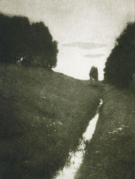 Curator: Ah, "Under The Harvest Moon" by John Atkinson Grimshaw. He created this nocturne in 1872. It's an oil painting capturing a rural scene bathed in moonlight. Editor: There's something unsettling, yet alluring about the piece. That almost monochrome palette and indistinct skyline definitely create an air of mystery and stillness. Curator: Grimshaw was known for his cityscapes and landscapes, often at night. The Industrial Revolution was in full swing, yet he idealized the countryside. Editor: The scene looks serene, almost romantic, but I can't shake the feeling of societal contrast. How might the artist and his patrons have reconciled industrial progress with this yearning for an idyllic rural past? Curator: Grimshaw appealed to the Victorian sensibilities, didn’t he? The painting romanticizes nature, almost erasing the impact of industrialization that was changing England at the time. Editor: I think it's crucial to consider who had access to these landscapes – both physically and artistically. Was this nature accessible to the working class, or was it a curated vision of the landed gentry? Whose labor created these landscapes, literally and metaphorically? Curator: Those are insightful questions. Grimshaw marketed these idyllic scenes primarily to the middle class, feeding their nostalgia and, perhaps, a certain desire for social separation during a period of intense societal restructuring. His use of light really accentuates the feeling of isolation. Editor: Right, the almost theatrical lighting turns a natural scene into a carefully staged image. That narrow, winding road might represent not only a physical path, but also the precarious journey into modernity itself. What do we lose, and what do we gain? Curator: These paintings allowed urban audiences a safe, controlled experience of the countryside from which they were becoming increasingly disconnected. This fits within broader art market trends of the time. Editor: Perhaps that carefully staged vision speaks to something deeper: a longing for connection, a yearning to bridge divides. Grimshaw offers an entry point to crucial conversations, a place to reckon with historical legacies and imagine more equitable futures. Curator: Indeed, it's much more than just a pretty landscape painting. It’s a cultural artifact, revealing the values and tensions of its time. Editor: Exactly. These aren't just images; they’re mirrors reflecting our histories and potentially inspiring paths to transformation.