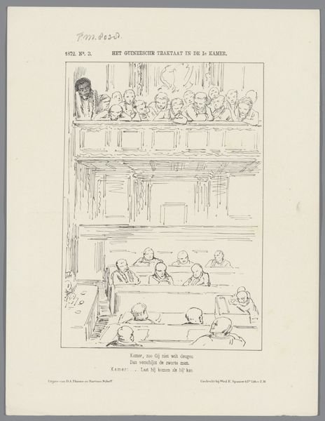 Editor: Here we have "Spotprent over de censushervorming in de Tweede Kamer, 1872", created by Johan Michael Schmidt Crans in 1872, using drawing and printmaking techniques. It seems to depict the Dutch Parliament. There's a rather somber atmosphere... almost dreamlike. What can you tell me about it? Curator: This print offers a glimpse into the tumultuous political landscape of the Netherlands in 1872. It's specifically referencing the proposed census reform, which aimed to alter voting rights based on property ownership. Caricatures like these played a significant role in shaping public opinion and challenging established power structures. Editor: So the figures floating above – who are they meant to be? And what's the significance of their ethereal presentation? Curator: The figures are likely leading politicians of the time, perhaps those most closely associated with the census reform. The cloud-like depiction suggests a detachment from reality or perhaps hints at the perceived illusionary nature of their policies. Consider the context: the press was rapidly gaining power, and such imagery would have fueled public debate about the fairness and representation within the government. Editor: It feels quite critical, even subversive, considering the constraints of the time. Were such prints common then? Curator: Absolutely! Political satire had a rich tradition in the Netherlands. Prints circulated widely and offered a potent visual commentary, especially in times of political and social change. It's important to analyze how the artist used imagery to frame the debate and mobilize public sentiment either for or against the proposed reforms. What’s your understanding of censorship? Editor: Well, looking at the empty benches, with these figures looming over, I think it is a very sharp observation that illustrates the power dynamics. Thanks for this overview. Curator: My pleasure. It underscores the significance of visual media in shaping social and political narratives.