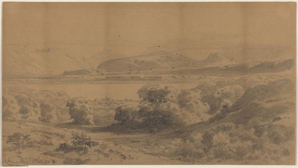 Curator: Before us is "Heuvellandschap met brug over het water," or "Hill Landscape with Bridge over Water," an etching and drawing by Auguste Numans, likely created between 1833 and 1880. What strikes you first about this piece? Editor: Well, it has this tranquil, almost melancholic atmosphere. The muted tones, the slightly decaying bridge, and the stillness of the water evoke a sense of passing time and perhaps a bit of faded glory. Curator: Absolutely. Bridges, throughout history and across cultures, often represent transitions, connections between different realms, both physical and spiritual. Considering the Romanticism style, what connections could we consider here? Editor: Given the timeframe and style, it feels like a yearning for a simpler, perhaps idealized, past. That bridge could be a metaphor for a link to that past. But the slightly broken structure suggests that connection is fragile, maybe even lost. It feels a bit mournful, don’t you think? Like remembering something precious that is gone. Curator: I agree. It also prompts one to contemplate nature’s enduring power versus human endeavor. Numans is capturing the tension between the wild, untamed landscape, and humanity's attempts to control it with architectural elements. The mountain looms large in the background—indomitable, immutable. Editor: And those meticulously etched lines that compose the mountains! They're practically vibrating with geological time. The Romantic painters really knew how to make mountains meaningful. Though here, there's a softer hand at play, maybe reflecting a more personal or reflective turn than some grand statement. Curator: A landscape reflecting personal memory is plausible. What Numans achieves through the relatively simple medium of etching is to suggest the weight of history, memory, and nature's dominance. Editor: Yes. I'll look at this bridge differently now; I came to see only melancholy, but will leave contemplating how humans bridge divides, literally or figuratively. Curator: Exactly, there is so much conveyed within a seemingly quiet landscape, encouraging us to connect more deeply to the work and to the self.