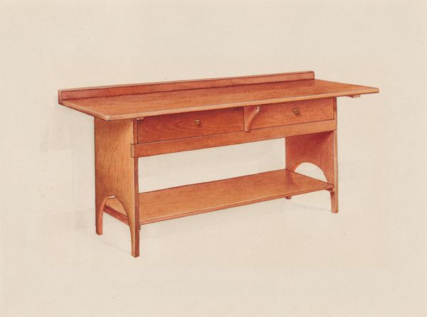 Alfred H. Smith made this Shaker Refectory Table with Benches sometime between the late 19th and early 20th century, in watercolor, graphite, and colored pencil on paper. I’m really struck by the rendering here, the way Smith uses a limited palette to give us just enough visual information. There’s this really gorgeous warm honey tone on the tabletop, with an almost imperceptible grain, and then that lovely, muted red on the benches and the trim of the table. The whole thing is rendered with such care. Look at how the shadows are depicted, just a gentle wash of grey, giving the whole scene a ghostly, ethereal quality. What Smith has achieved is a kind of quiet monumentality that reminds me of some of those early American folk artists like Joseph Pickett. I like to think of art as an ongoing conversation, a kind of call and response across time. And this drawing is a beautiful articulation of that idea.