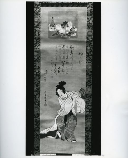 Editor: Here we have Suga Mitsusada’s "Pleasure Quarters," created sometime between 1738 and 1806, using ink and woodblock printing techniques. The composition feels really unique with that contemplative figure at the bottom, calligraphy in the middle, and the little image at the top. How do you interpret this combination? Curator: This work opens up fascinating dialogues about representation and social hierarchy within the Edo period. Consider the title itself. "Pleasure Quarters" implies a specific social space often associated with entertainment, but for whom? Who has access to such a space and on what terms? The lone figure seems relaxed and contemplative, yet his attire may indicate his class. Do you notice how he’s separated spatially from the calligraphy and the floral motif above? Editor: Yes, the isolation is striking! Almost like layers of society being presented. Curator: Exactly. The calligraphy, rendered in elegant strokes, could be alluding to classical texts or high culture ideals which creates contrast. Meanwhile the floral image invokes themes of transient beauty. Considering that art from pleasure quarters often depicted women and fleeting encounters, Mitsusada seems to be engaging in social commentary. Editor: So the painting is sort of layering these social positions? What do you make of that contrast? Curator: The spatial arrangement is interesting because of the distinct, clearly defined visual sections. Is it creating tension by separating high from low or masculine from feminine, or both? It forces us to reflect upon the intersections of class, leisure, and artistic expression. What are your thoughts about that? Editor: That’s really interesting. I was initially focused on the visual elements, but seeing it in terms of social commentary completely shifts my understanding. Curator: Right. This Ukiyo-e scroll gives us a moment to consider how historical and cultural forces shape artistic expression and reception, as well as the complexities of social stratification during the Edo era.