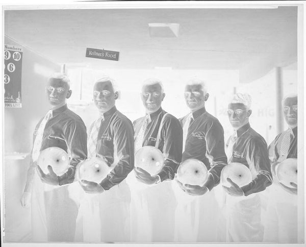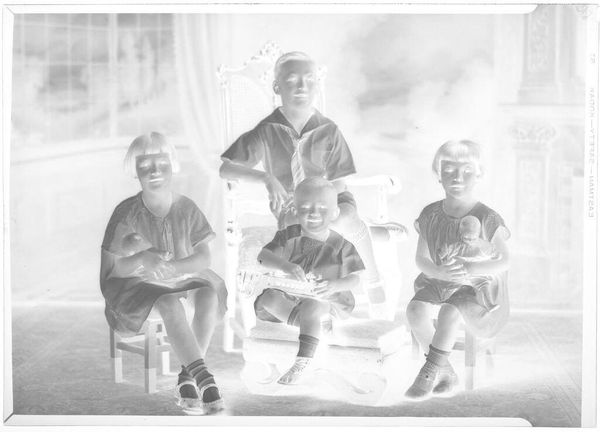 Editor: This is Martin Schweig's "Untitled (studio portrait of six young boys arranged from tallest to shortest)" from the Harvard Art Museums. The stark contrast in this photographic negative emphasizes the textural differences in their clothing. How do you interpret the formal arrangement? Curator: The composition is rigorously structured, isn't it? Notice how the gradient of height creates a visual rhythm. The tonal inversion complicates our reading of depth and surface. Does this abstraction alter the reading of childhood innocence for you? Editor: It does, in a way. The negative space around the figures almost isolates them, heightening the focus on their expressions, but also on their physical forms. Curator: Precisely. The formal qualities elevate the portrait beyond a simple documentation, prompting us to consider the interplay of light, shadow, and form. Editor: I see what you mean. Looking at it this way really brings out a different understanding. Curator: Indeed, a close formal reading reveals much about the artist's intent and the photograph's aesthetic impact.