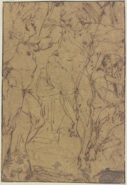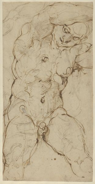Curator: It’s a rather lovely drawing in charcoal with touches of colored pencil, by Luca Signorelli. It's called "Two Nude Figures," thought to be from around 1500. It feels... preparatory, somehow, doesn't it? Like a fleeting idea captured for later exploration. Editor: There’s a certain dynamism, but I wonder how the focus on the male nude plays into the socio-political context of the time. Curator: It’s fascinating, isn’t it? The way Signorelli renders the muscles—there's such a raw energy. One figure seems to be twisting, perhaps in anticipation or exertion. I find it very sensuous. It reminds me of childhood clay. Editor: While undeniably skillful, this idealized representation of the male form often excluded diverse bodies, perpetuating standards of beauty that reinforce inequality and exclusion, then and now. I’m curious about where Signorelli might have situated these figures within the power dynamics of his society. Who gets to be a "master" subject, and who is rendered invisible? Curator: True, the canon is problematic, no doubt! It's easy to get swept up in that Renaissance passion. Editor: I appreciate your insight, however, such passion can gloss over the structural forces that continue to uphold discriminatory practices, so maybe that charcoal smudge on the paper symbolizes the erasure of entire subjectivities... Curator: Maybe you're right. What if those lines denote a space where difference is explored and questioned, not ignored? That shifts everything, really. We’re all trapped in history, even Renaissance artists. Editor: Exactly, and by looking at the sociopolitical environment of 16th century Italy, we might develop a fresh lens that will ultimately grant us insight on a more global understanding of this work and its significance, for centuries to come. Curator: Beautifully put. Art really only lives when we look through it, beyond its surface and back again.