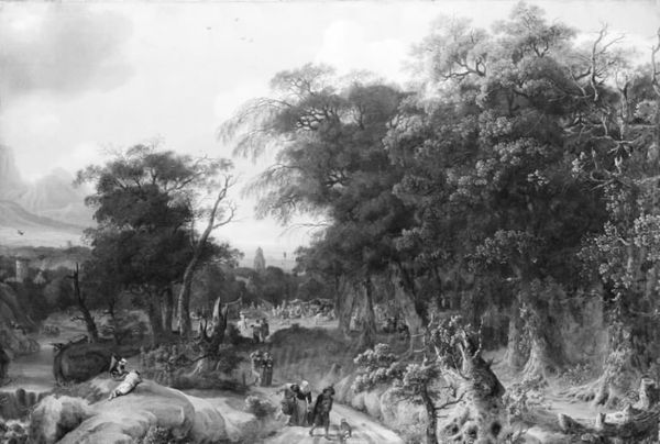 Curator: Oh, my. Even in monochrome, the vibrancy practically leaps off the canvas, doesn’t it? Editor: Indeed! What we are looking at is Christian David Gebauer’s "Landscape with Cattle," painted in 1816. Look at how he organizes the various picture planes, how they converge near the horizon line. Curator: The texture in the painting is remarkable. Even in what looks to be only black and white, the nuances feel tactile, almost like a memory surfacing. It feels like coming home on a summer evening. Editor: Yes, note Gebauer's sophisticated employment of atmospheric perspective to portray space. Notice how the use of tonality establishes depth through the hazy distant background elements that dissolve within the atmospheric conditions. Curator: Absolutely, I get lost in the gentleness. How would you define the impact of the people moving within it? It is very dreamlike... Editor: Well, people and livestock moving on land serve a vital function. Semiotically, they bring a degree of relatability; they help viewers empathize, to measure their place within the bigger picture. The soft luminescence further amplifies this idea by adding romantic sentiment to something both universal and shared. Curator: So, it is all connected, we can measure ourselves within it. Now you are getting me hooked! And perhaps there is more for each of us to take from such an intimate setting—don't you think so? Editor: Perhaps... Although the artist does embrace romanticism and realism here to trigger feelings, a visual breakdown remains vital. Curator: I see. I think both ways give an opening, another perspective to what lives within. What about that is most impactful for you, right here at the end? Editor: For me, Gebauer illustrates the power of painting technique that makes a scene memorable, evoking an immediate sense of presence that has been lost in monochrome images.
