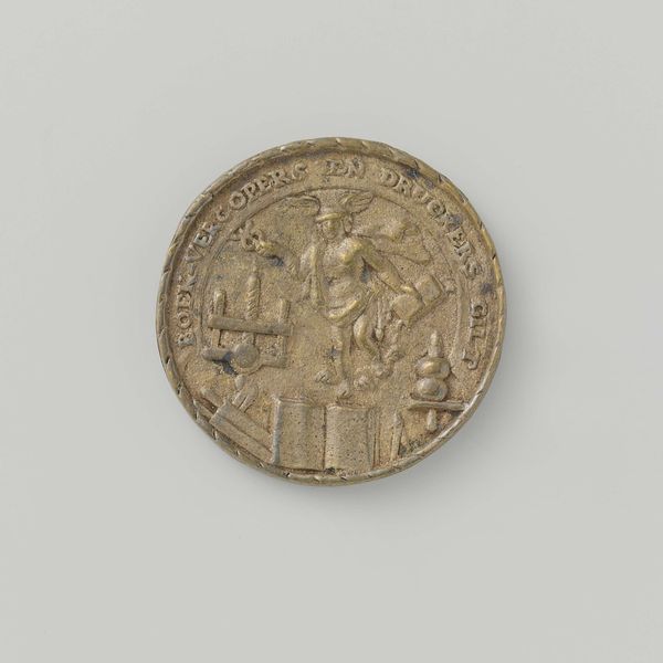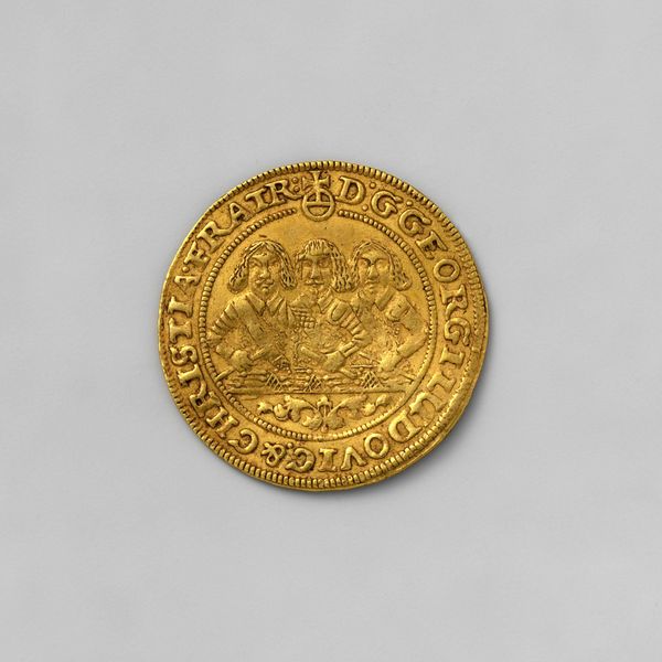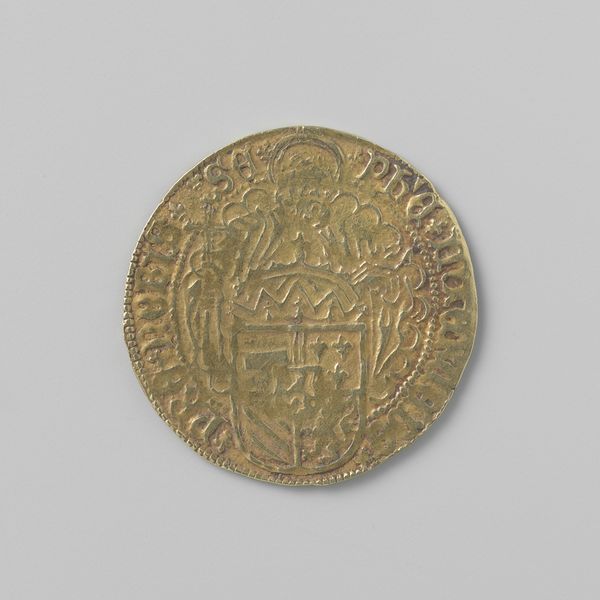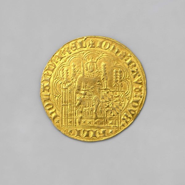 Curator: Let’s turn our attention to this gold guilder. Minted between 1378 and 1388, it features William V of Bavaria, count of Holland, and holds the distinction of being the first gold coin from the County of Holland. Editor: My immediate impression is one of miniature power. The scale is so small, yet the craftsmanship and the symbolism—the regal figure, the glint of gold—speak volumes about authority and wealth. Curator: Absolutely. The material itself, gold, is so crucial here. Consider where that gold came from, the labor involved in mining and refining it. And then, to be formed into a coin… it represents a tangible concentration of resources and control. It served as both a currency and a potent symbol for the ruling elite. Editor: Focusing on the coin’s composition, I’m struck by the contrast between the central figure in high relief and the flatness of the surrounding field containing the inscription. It really pushes William V forward, emphasizing his presence and, symbolically, his power. Also, notice how the delicate embossed details in his attire give it real presence. Curator: It's a remarkable example of medieval craftsmanship but more than just aesthetics, this coin tells a story about the socio-economic landscape of the late 14th century. The emergence of gold coinage in Holland reflects growing trade and economic stability, indicative of power consolidation for Count William V. Editor: True, yet from a visual perspective, I can't help but note the almost iconic depiction of William. Sword in hand and shield at his side. Its graphic representation, even in miniature, projects unwavering command. It’s like a portable monument. Curator: And circulating these images! The message reaches far beyond court. This was medieval propaganda in your pocket, purse, or communal treasury, so that no one forgets who's in charge. Editor: It’s fascinating how closely these historical, material concerns intersect with questions of design and visual communication. To think that the aesthetics and power dynamics are so intertwined in an object this small. Curator: Indeed, examining objects such as this is more than looking at art, it's delving into the means of constructing power through craft. Editor: A fitting summary that has given me a richer understanding, beyond pure visual aesthetics.