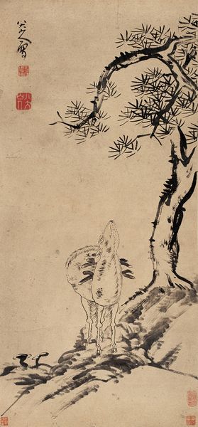 Curator: Isn’t this something? "Pine and Cranes" rendered in ink. It exudes a kind of stark elegance, don't you think? Editor: Elegant is a perfect word. I'm struck by the isolation. There’s a powerful sense of stillness; even the birds, seemingly in conversation, contribute to this pervasive solitude, perching on stark rock formations beneath that gnarled tree. The very emptiness around the central image adds a psychological depth to the painting. Curator: Bada Shanren, the artist, had quite the backstory too. A member of Ming's aristocracy, his life turned upside down with the dynasty's fall, eventually becoming a Chan Buddhist monk. Art became his solace, perhaps his silent protest. Knowing that, what do you see now? Editor: I see resistance, but also resilience. The pine tree, often symbolic of endurance, standing amidst political turmoil… it's a defiant gesture. The cranes themselves—symbols of longevity and wisdom—feel less like serene auspicious figures and more like watchful sentinels observing a changed world. It's a poignant statement about cultural memory and identity amidst chaos. Curator: The brushstrokes too have such vigor and almost rebellious flair about them. Note how economical he is, almost brutal, with ink, expressing volume and texture and yet there is very minimal use of the medium. The rough, dry brushstrokes contrast beautifully with the washes that define the background and the bodies of the cranes. I love it, this painting breathes a soulfulness into emptiness. Editor: Indeed. And let’s think about this "emptiness"—the negative space is an active element here. In Taoist philosophy, emptiness isn't just nothing; it’s potential. It holds possibility. By strategically utilizing it, Bada Shanren suggests that even amidst the loss and uncertainty there are endless transformative potentials. The question, really, is what we make of it. Curator: That’s beautiful, bringing us back to hope within that desolation. Well, it’s a painting that echoes through time, I suppose. Editor: Absolutely. Art allows us to continually re-evaluate not only what has been, but also what is yet to be. It reminds us to look closely at our own contexts.