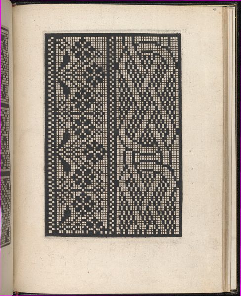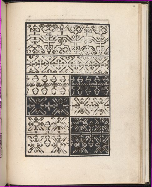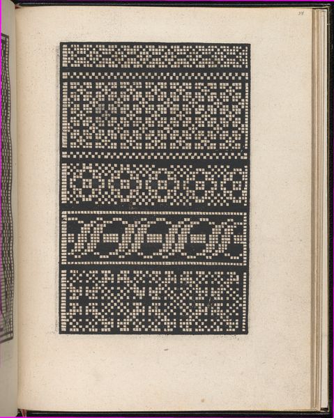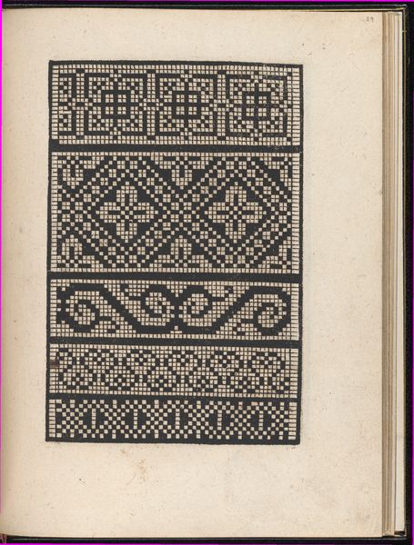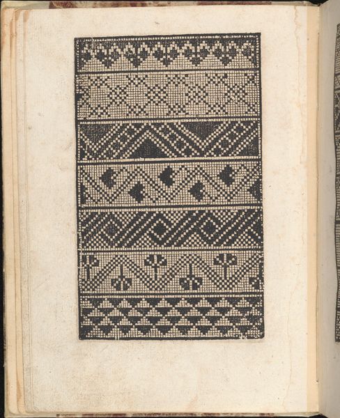 Curator: This is a page from "Ein new kunstlich Modelbuch..." by Peter Quentel, printed in 1544. It resides here at The Met. Editor: It looks like a sampler. Stark and ordered, almost mathematically precise in its stark geometry. I see repeated bands of intricate, nearly hypnotic designs. Curator: "Modelbuch" literally means "pattern book," aimed at artisans—specifically needleworkers— offering examples for embroidery and lacework. Editor: So, it was less about high art and more about applied art? A manual for the upwardly mobile artisan perhaps, who might wish to produce valuable luxury textiles for profit? Curator: Exactly. This speaks to the rise of a merchant class eager to emulate aristocratic tastes. These patterns, precisely rendered, disseminated artistic ideas. Consider the socio-economic implications of democratizing design! Editor: Intricate. When considering that its date predates many other better known artists of that time, one would not know how to appreciate the history behind such forms until coming to know the facts behind it! It is not to suggest a dry read! I see influences still being made today with textiles! How do you appreciate this kind of historical mark-making? Curator: What strikes me is how effectively the limited tonal range, just black ink on paper, suggests a rich material presence. There's depth created purely through skillful arrangements of line and shape. A profound lesson in the power of constraints! Editor: Seeing this artwork through both lenses - yours highlighting form, mine connecting it to culture, we've unpacked it to where you might better perceive these connections while observing its formal elegance. It really does create quite a strong graphic experience.