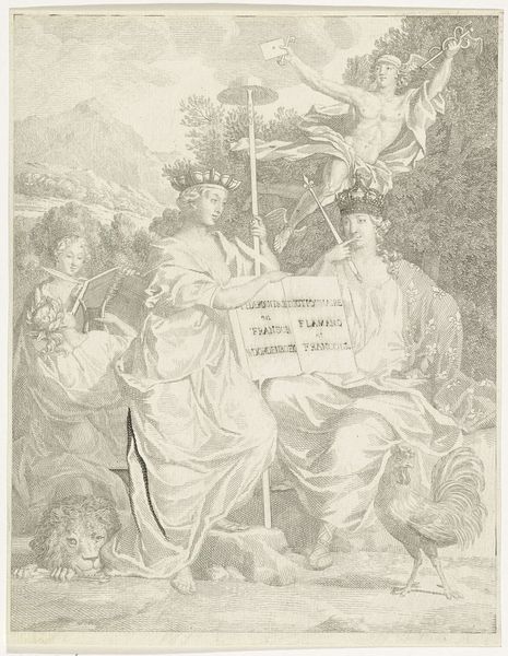 Jan Wandelaar created this print, Personifications of the Austrian Netherlands and France, around 1747. The central figures are allegorical, embodiments of nations, laden with symbols. Consider the rooster, a proud emblem of France, juxtaposed with the lion, traditionally representing the Austrian Netherlands. These animals aren't merely decorative; they evoke a visceral sense of national pride and identity. Above, Mercury, winged messenger and god of commerce, carries a letter, a symbol that echoes through time, from ancient Roman reliefs to modern corporate logos, signifying communication and exchange. Note the gesture of the personification of France, finger to the lips, a pose that appears in countless Renaissance paintings of allegories of Prudence or Poetry. It is a motif that speaks volumes about the transmission of cultural memory. The act of pointing to a word connects to a need to communicate and share knowledge, that resurfaces, evolving in meaning. Such symbols are not static; their meanings shift, accumulate, and transform across generations. In this context, they highlight the interplay of power, knowledge, and identity.