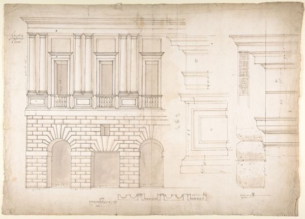 Curator: Adler and Sullivan's "Revised 24th Street Elevation for Standard Club, Chicago, Illinois" captures the meticulous design of a building that sadly no longer exists. The rendering, made with ink on paper, dates back to approximately 1887. Editor: Immediately, I'm struck by the solidity and the feeling of almost fortress-like presence. There's a strong emphasis on the horizontal, and a weightiness communicated through all of those precisely drawn stones. Curator: Absolutely. It speaks to the social ambitions embedded in architecture of the late 19th century, the desire to project stability and permanence through the built environment, particularly for social clubs like this one which were important nodes of community and commerce. Editor: And I see recurring arch motifs over the windows and doors. In architectural symbolism, arches represent gateways, transitions, a movement into a different state of being. Were these spaces intended to transform one's experience? Curator: Likely. Social clubs offered refuge from the bustling city, places for networking, leisure, and self-improvement. These archways literally and symbolically demarcated transitions from public to private spheres. Editor: Notice also how geometric forms play out across the facade—rectangles stacked and interspersed with semi-circular windows, an organized system of symbolic meanings, where simple forms could translate societal order into material substance. The image offers itself as a type of code for upward mobility. Curator: Very true, and it represents a key transition in Adler and Sullivan's work as well, reflecting a movement towards a more elaborate decorative vocabulary which would find its ultimate expression in their later skyscrapers. Editor: This architectural elevation really goes far beyond its function as a building plan; it embodies ambition, social ideals, and even a philosophical approach. Curator: Seeing how the social context can shape something like a design elevation is powerful—to recognize buildings as testaments to ambition and change. Editor: Absolutely. Considering how potent these symbols continue to be throughout the culture gives even greater insight into ourselves.