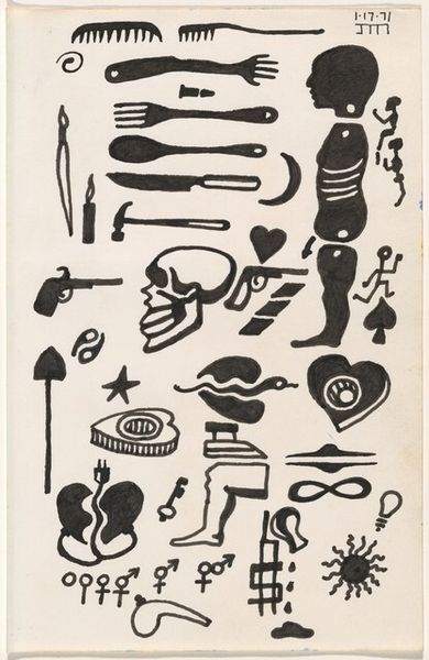 James McCracken Jr. made this untitled study for a tattoo book with ink on paper, sometime in 1971. I love the directness of it, the way the images are laid out like a sheet of flash art, ready to be picked and stuck on someone’s body. The ink is applied with confidence, each line a decision. There’s a real clarity to the shapes – hands and skulls, each one with its own twist. I’m drawn to the hand-skull hybrid at the top right, the way the artist combines the skeletal face with a pointing finger. It's so simple, yet it speaks volumes. It's like a memento mori for the age of social media. Thinking about process, you can see how McCracken is playing with signs and symbols. It reminds me a little bit of Philip Guston’s later work. Both artists are using a kind of personal iconography, creating their own language in ink to explore mortality and the human condition. It’s a conversation between artists that transcends time.