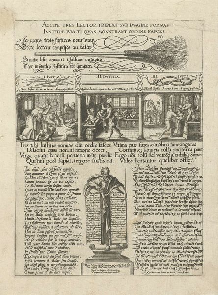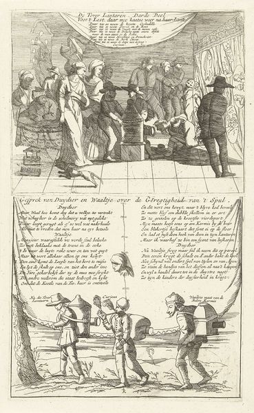 This is "De toverlantaarn" made around 1720 by Jan de Ridder, a print that uses etching and engraving. Notice how the composition is divided into distinct registers, creating a vertical narrative flow. The upper register depicts a gathering, while the lower one shows figures carrying lantern-like boxes. De Ridder employs line and texture to define shapes, but the figures' forms are distorted. The artist destabilizes established representations of form. Are these cultural codes intended to be satirical? The characters in the upper register seem to be observing some kind of spectacle. In the lower register are figures who are hunched over. This positioning makes the forms appear to function as signs within a broader cultural and philosophical discourse. The artwork is a site of ongoing interpretation. The organization of shapes and forms invites an interpretation of social hierarchy.